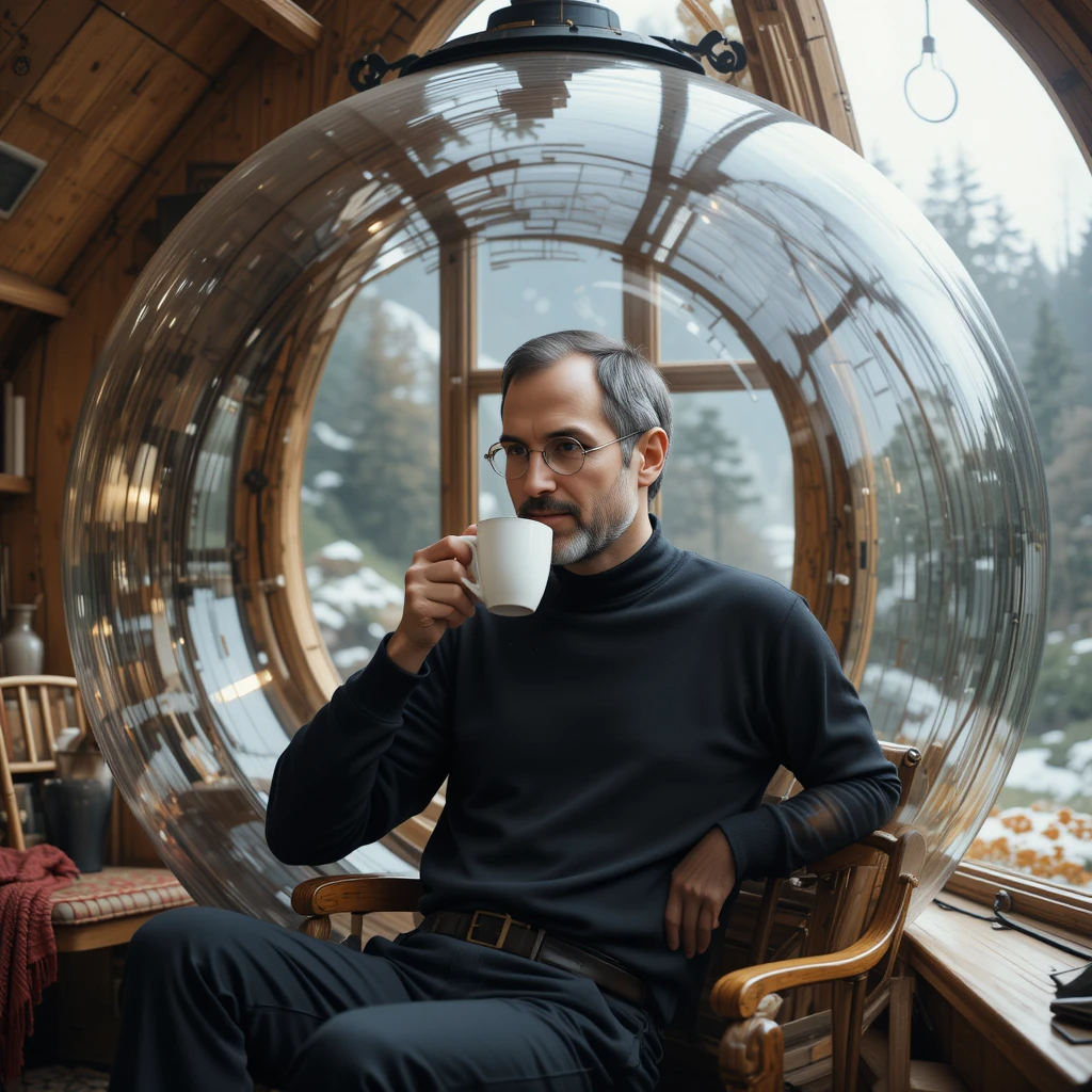 Steve Jobs in space drinking coffee inside an American-style wooden house surrounded by a huge glass bubble