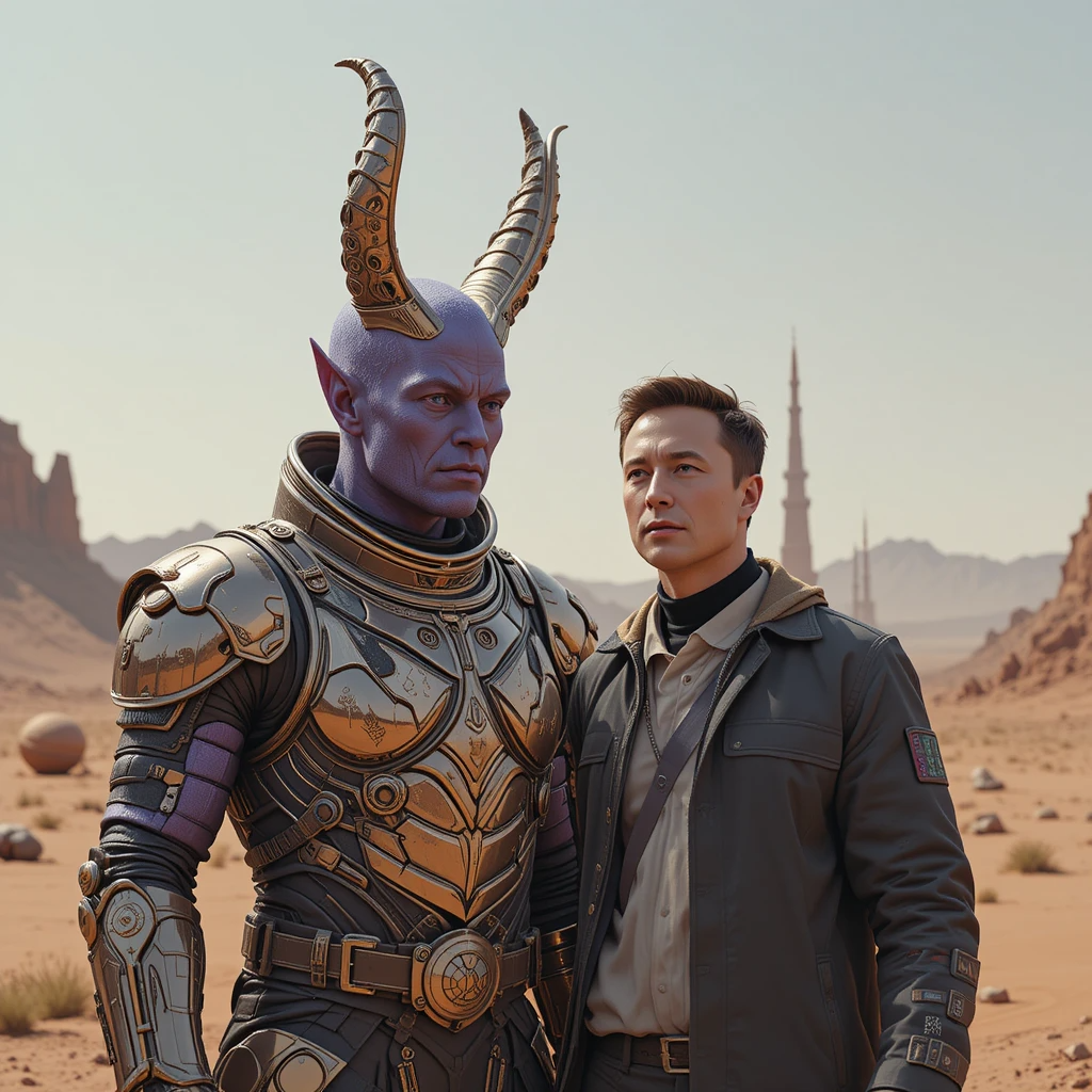Leader Beerus with Elon Musk on Mars in the middle of the space glass city